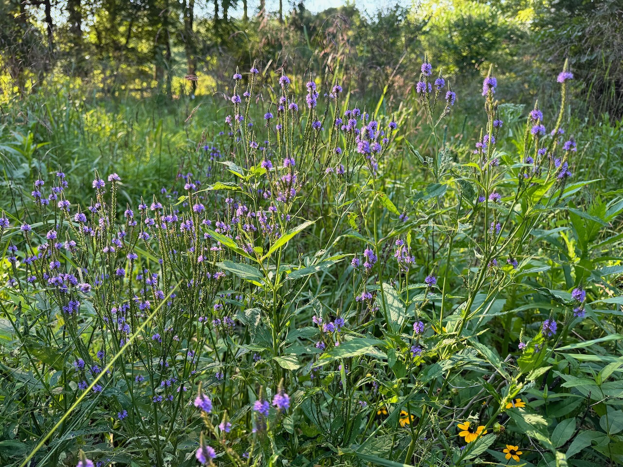 Over the past few years I’ve also begun adding plugs of wildflowers, sedges and grasses inside tree and shrub cages. This meets several goals: suppressing the spread of species that are not helpful to wildlife, creating a habitat-rich ground layer from the get-go, and—especially pertinent to the topic at hand—helping more vulnerable herbaceous species grow enough to set seed and eventually spread outside the cages.